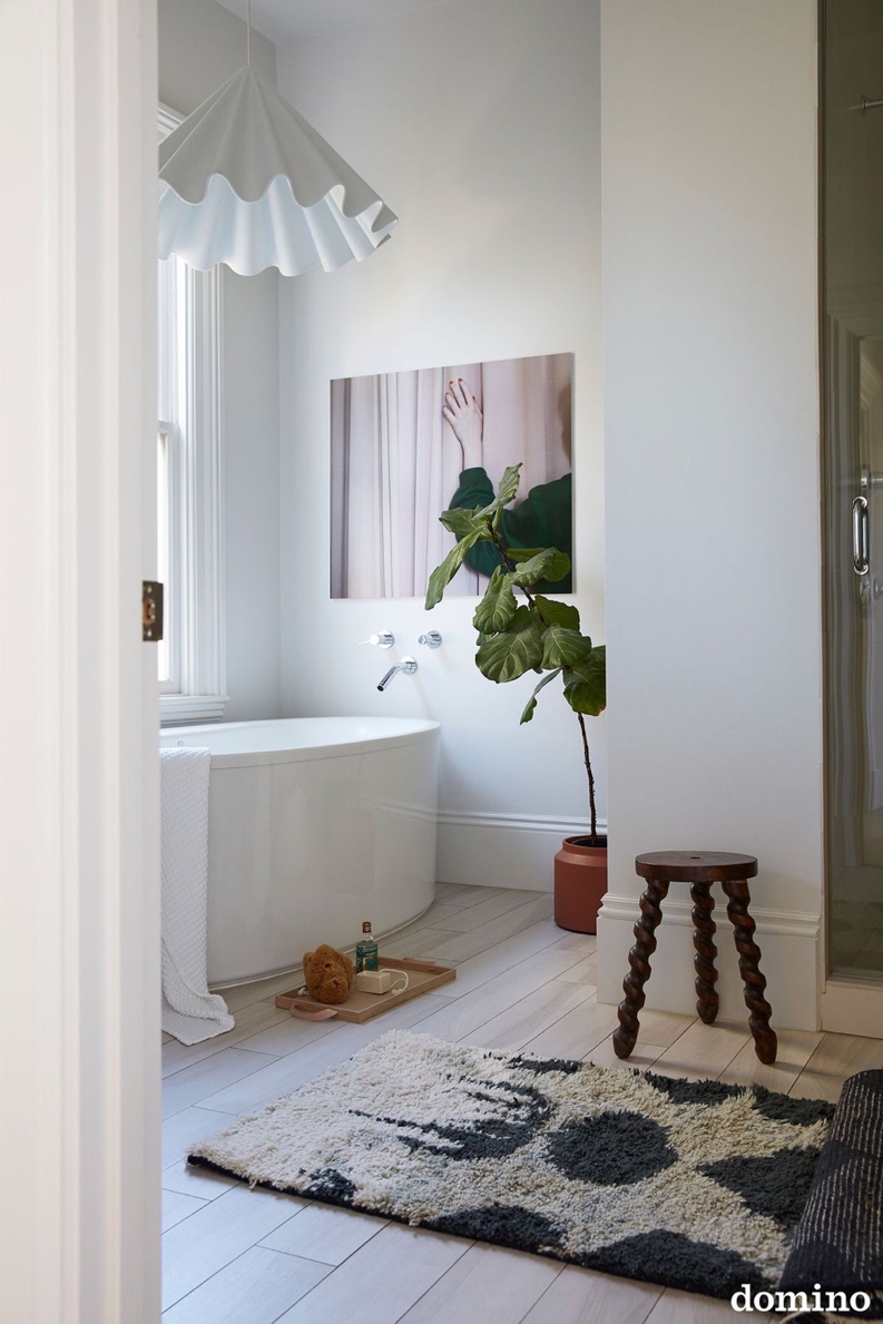 The bath is simple, the light fixture is sculptural, and the art adds mystery. A pop of greenery, and a large light filled window, all adds up to the perfect combination. Consider a rug rather than a bath mat, for a more permanent design statement, that grounds the space even more.